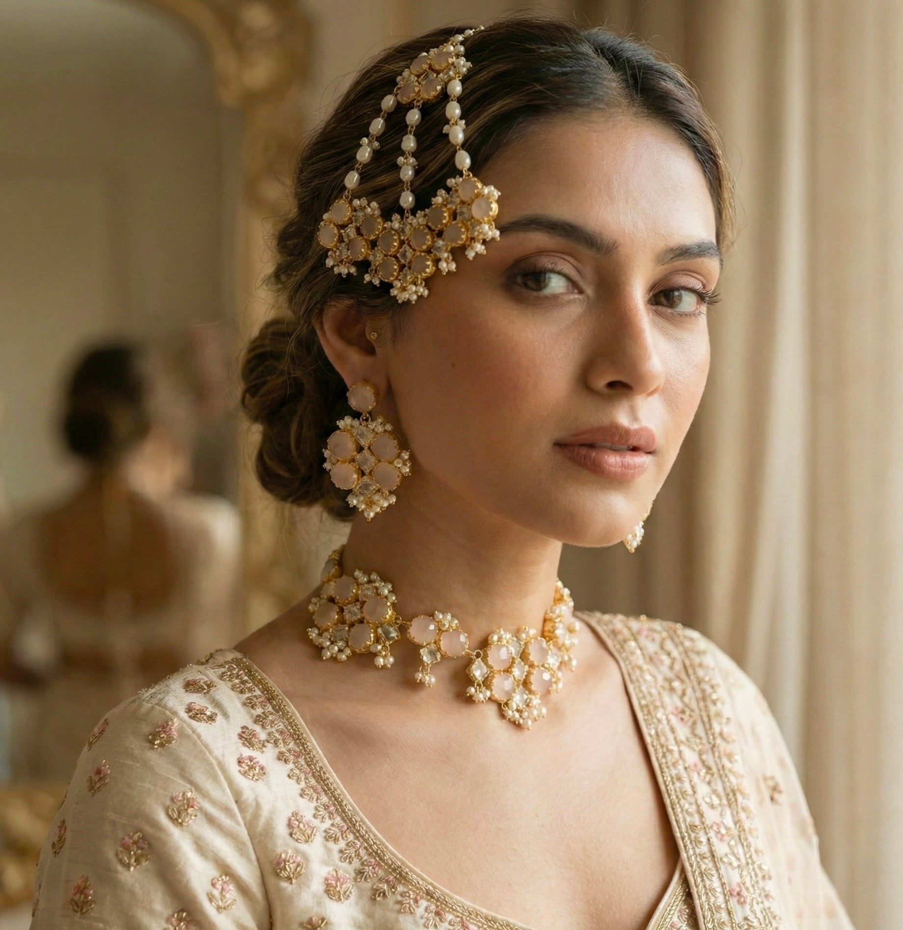 Discover the Amara Pink Choker Set, a captivating statement piece adorned with soothing rose quartz stones and dazzling cubic zirconia crystals. This elegant set includes matching drop earrings, a tikka, and a statement jhumar, designed to complement each other perfectly. Ideal for adding a refined touch to your traditional attire, the Amara Pink Choker Set blends timeless beauty with modern charm to make you stand out on any special occasion.