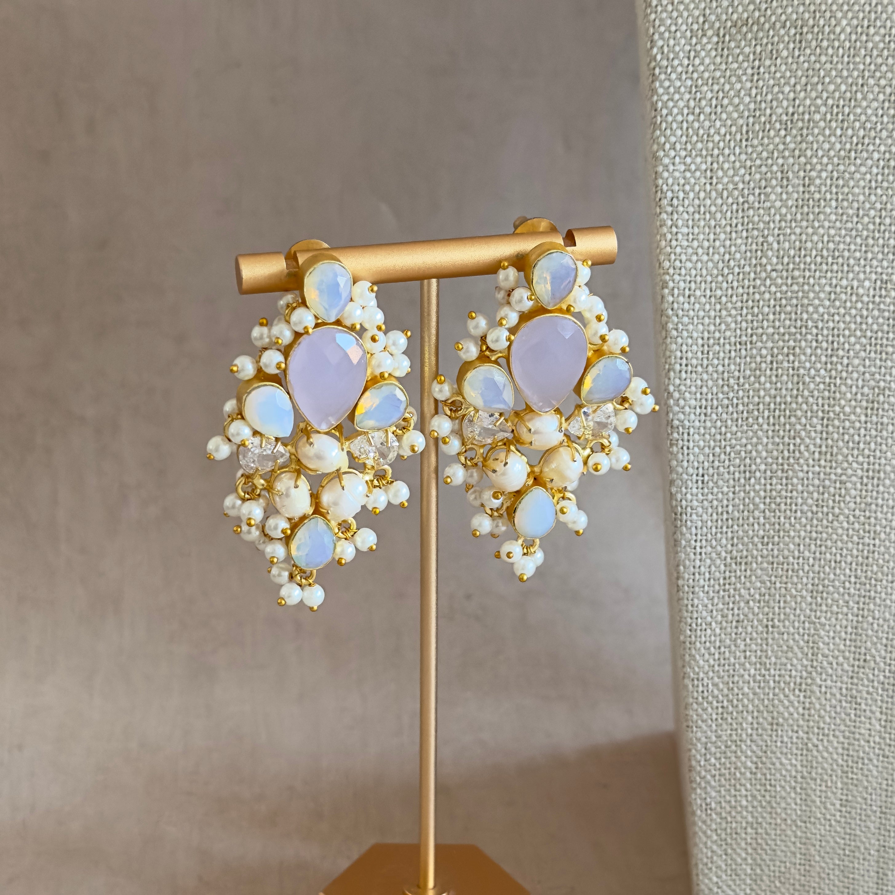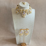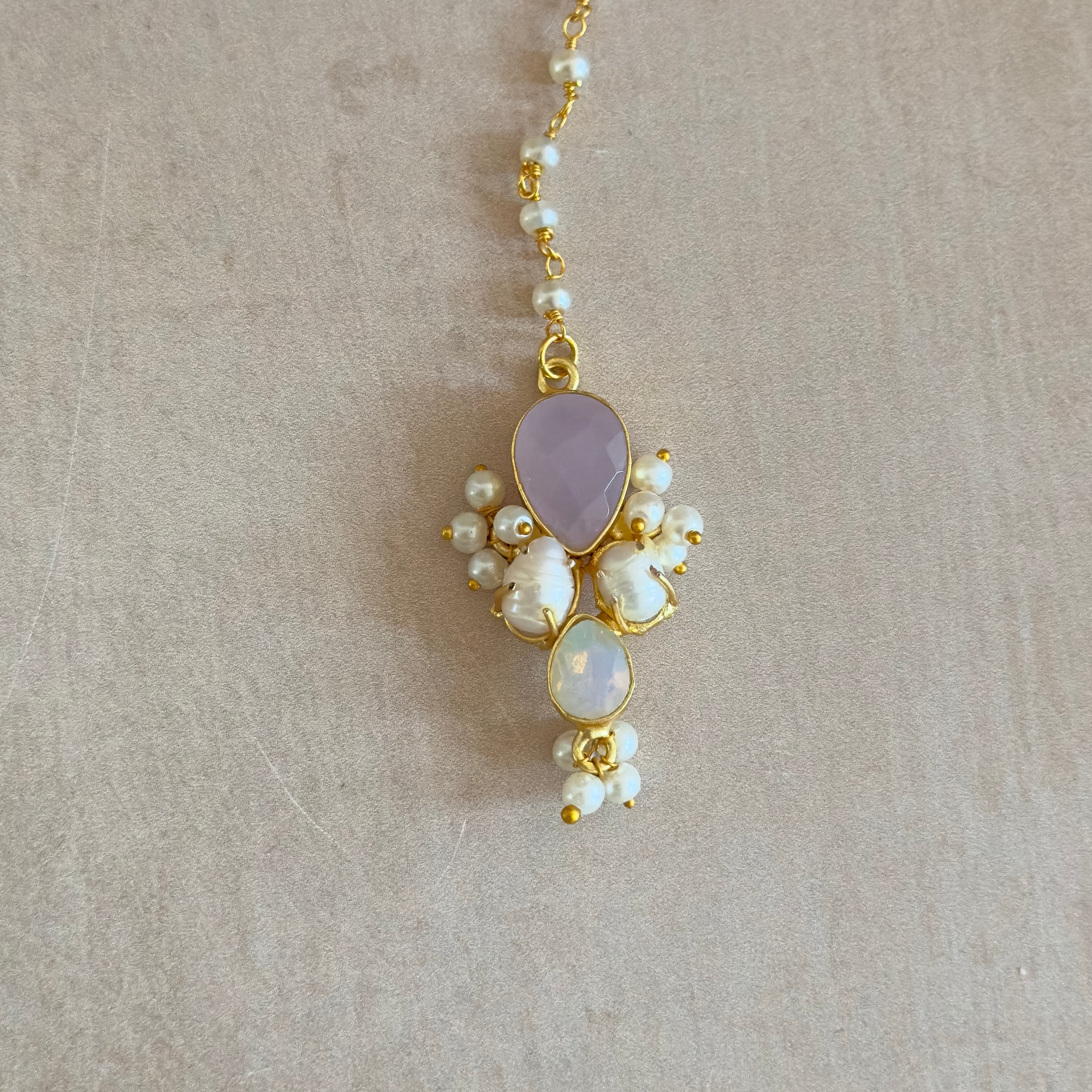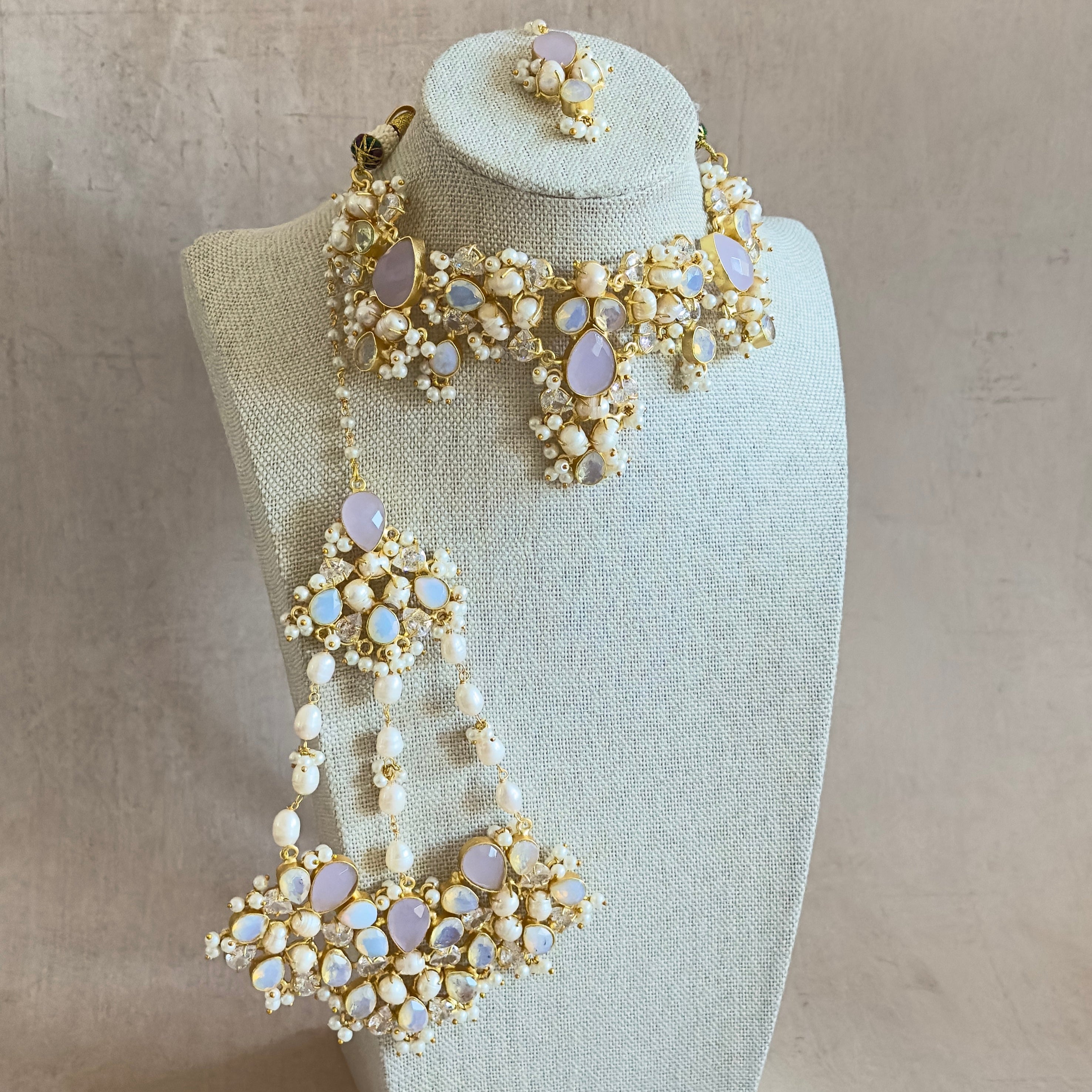 Elevate your elegance with the Antonia Lilac Choker Set, featuring delicate hues of lilac paired with opalite stones, pearls, and sparkling cubic zirconia crystals. This exquisite set includes stud earrings and a tikka, designed to complement your style with graceful sophistication. Perfect for special occasions.