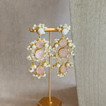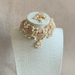 The Erina Rose Choker Set showcases stunning rose quartz stones, enhanced with sparkling cubic zirconia crystals for a subtle yet striking shimmer. This sophisticated set includes matching statement drop earrings and a tikka, designed to create a cohesive and graceful look. Perfect for special occasions, it adds an elegant touch to any outfit with its refined combination of soft hues and dazzling accents.