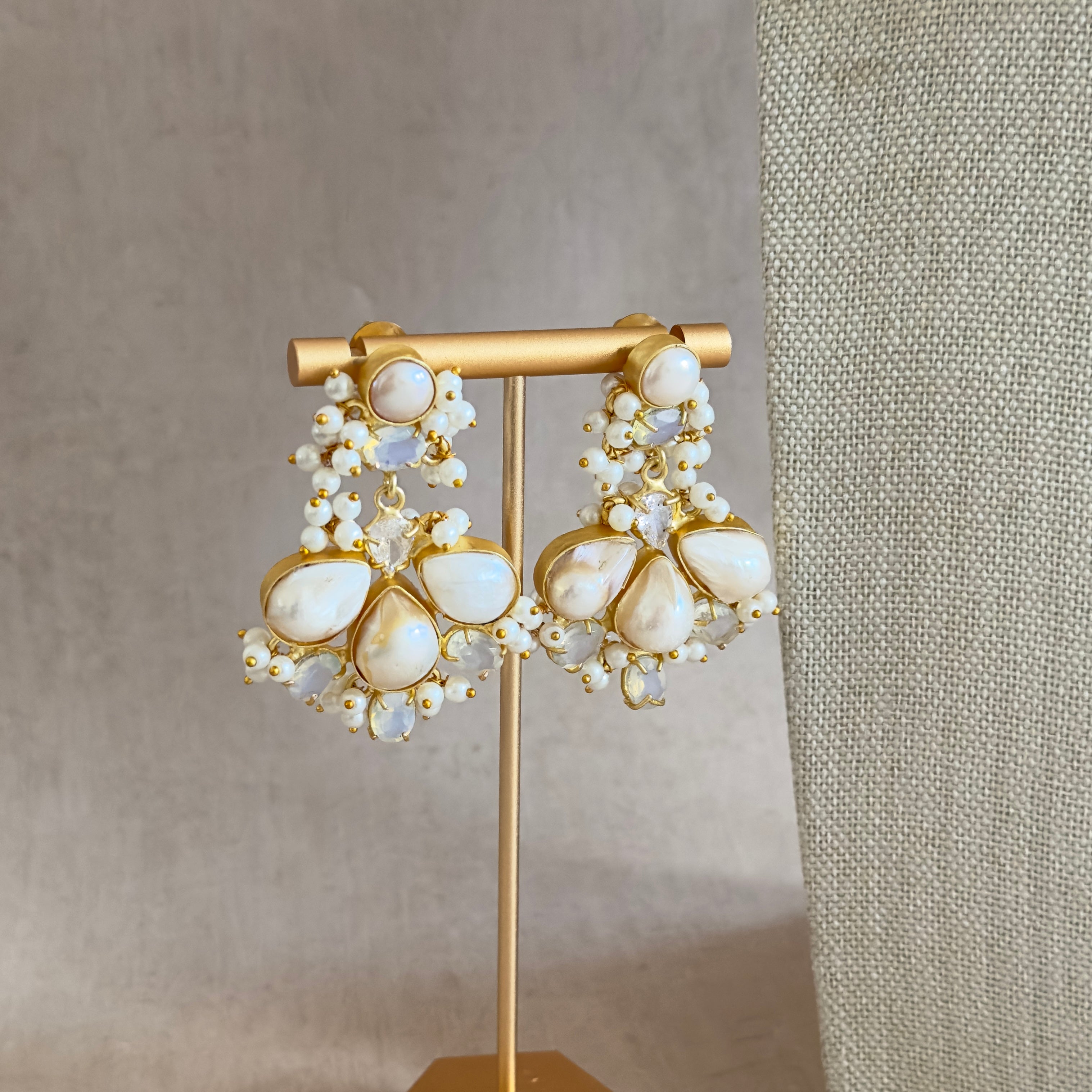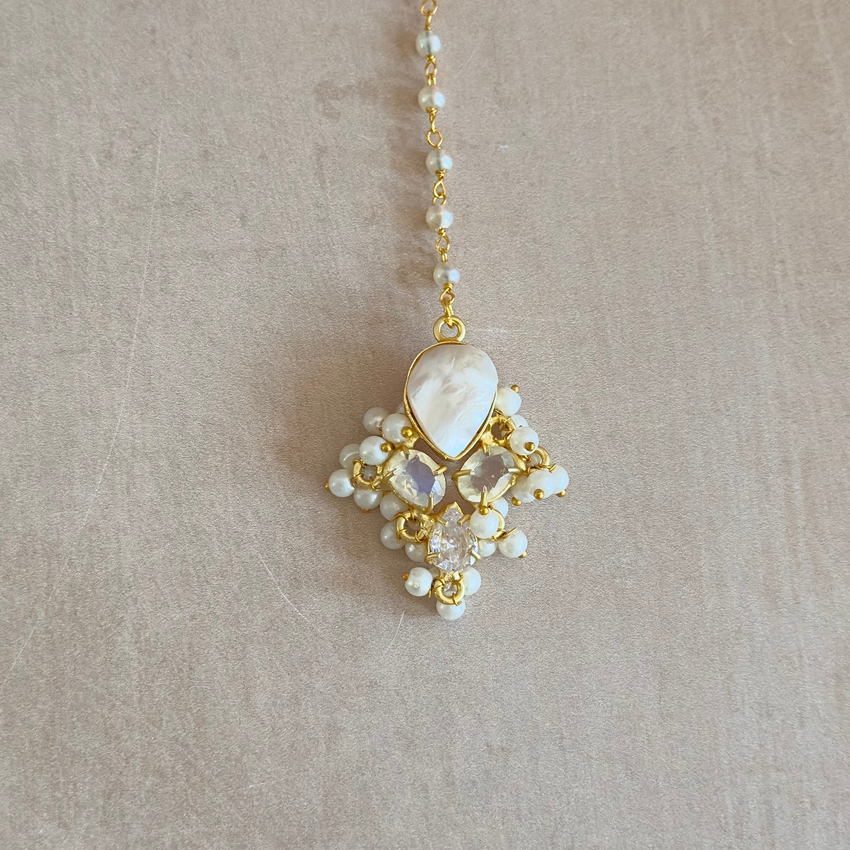 The Inaya Crystal Pearl Choker Necklace Set showcases the natural beauty of baroque pearls combined with the ethereal glow of opalite stones. This stunning set includes a choker, matching drop earrings, and a tikka, creating a harmonious look. Perfect for special occasions, it adds a touch of sophistication and charm, making you stand out with a unique blend of classic and contemporary style.