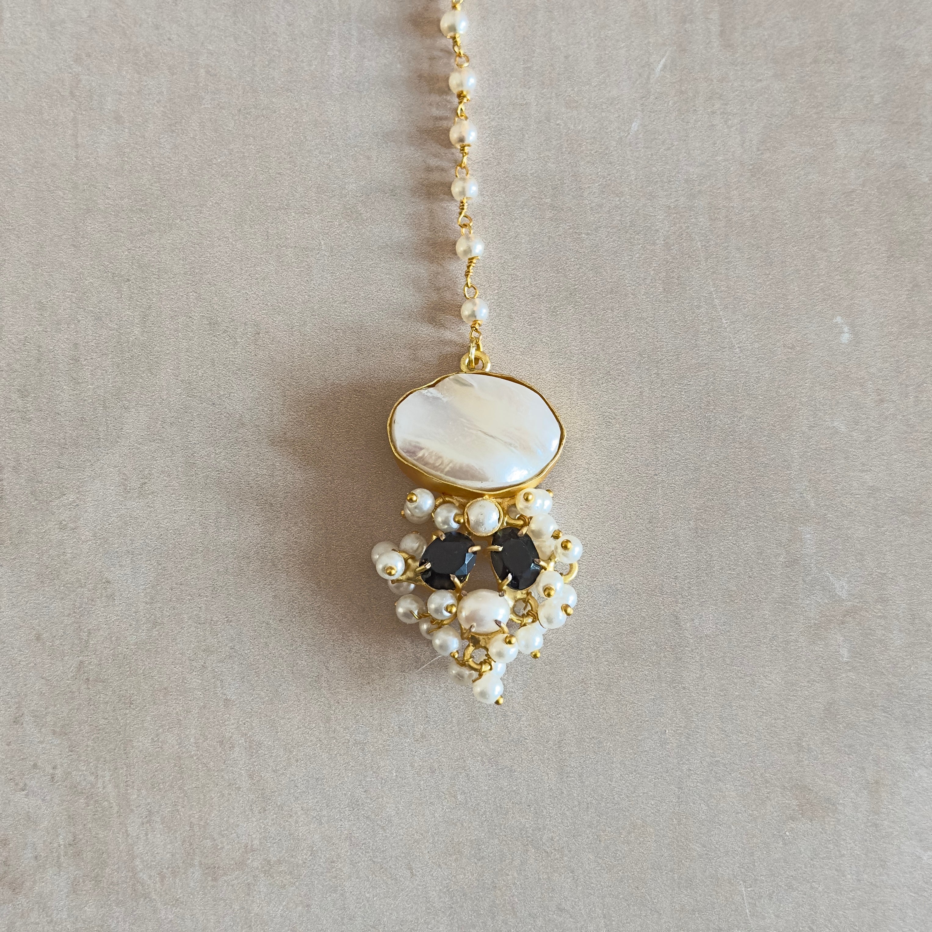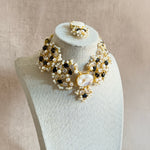 Elevate your style with the Irum Black Pearl Choker Set, featuring lustrous baroque pearls paired with striking black onyx and sparkling cubic zirconia crystals. This statement choker, complemented by matching stud earrings and a tikka, offers a perfect blend of sophistication and bold charm. Ideal for special occasions, it effortlessly enhances your look with its unique design and captivating contrast. Make every moment unforgettable with this exquisite jewellery set.