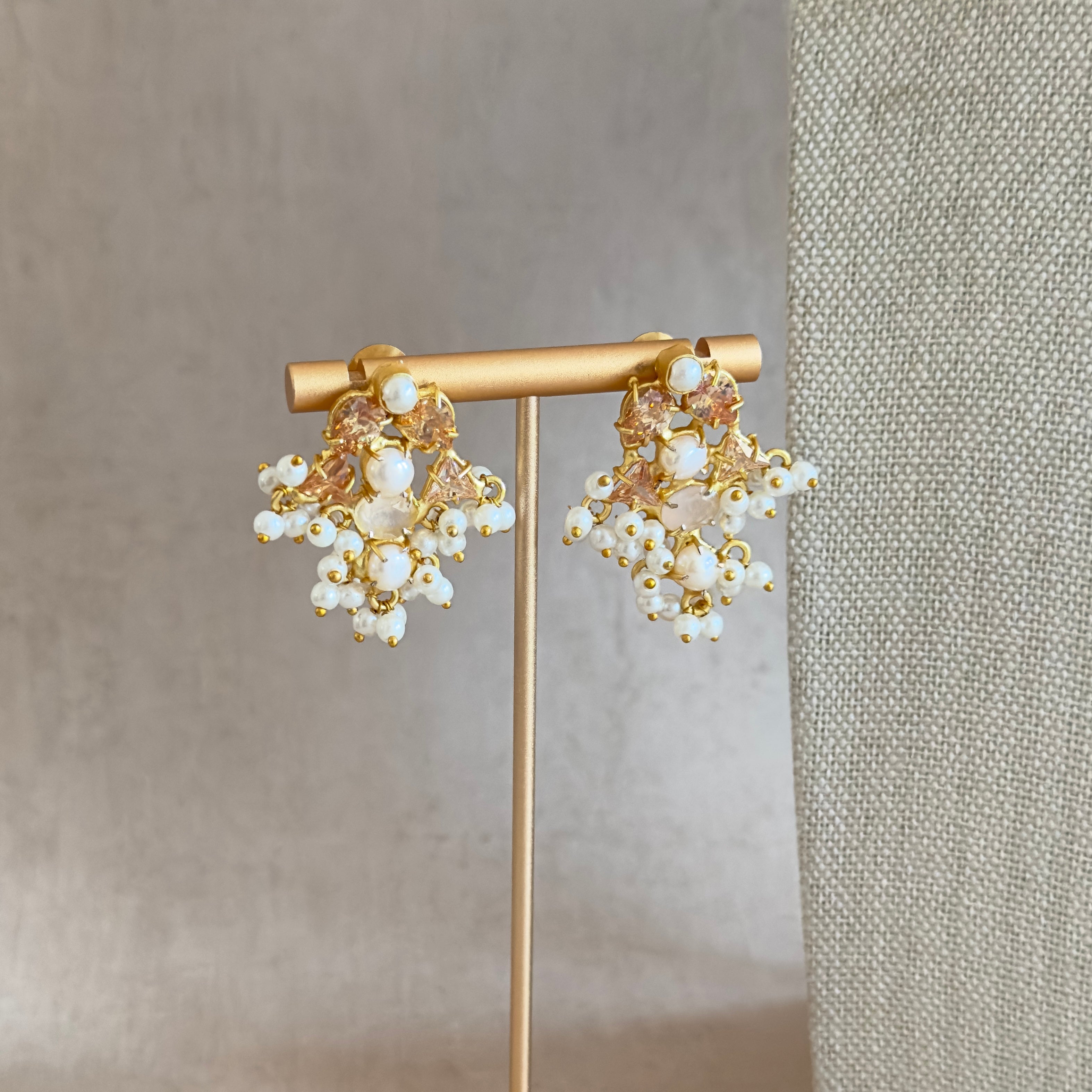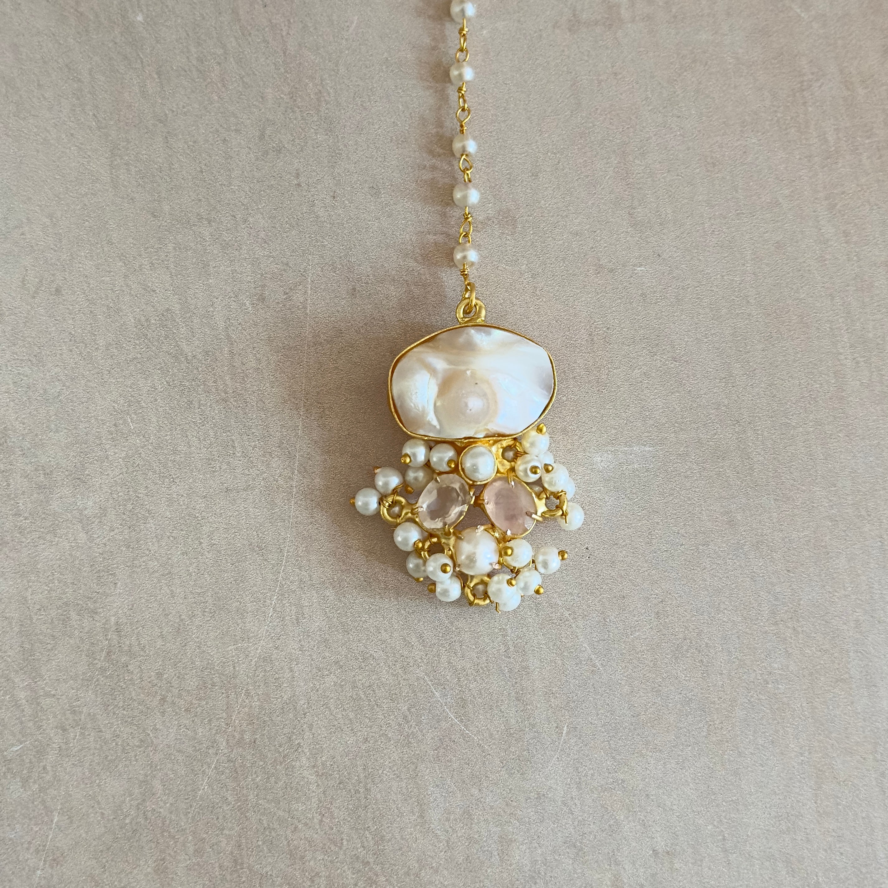 Discover the new exclusive Irum Rose Choker Set, where soft rose quartz stones meet the warm glow of champagne gold sparkling cubic zirconia crystals. This stunning set includes matching stud earrings and a tikka, perfectly designed to elevate your look with elegance and charm.