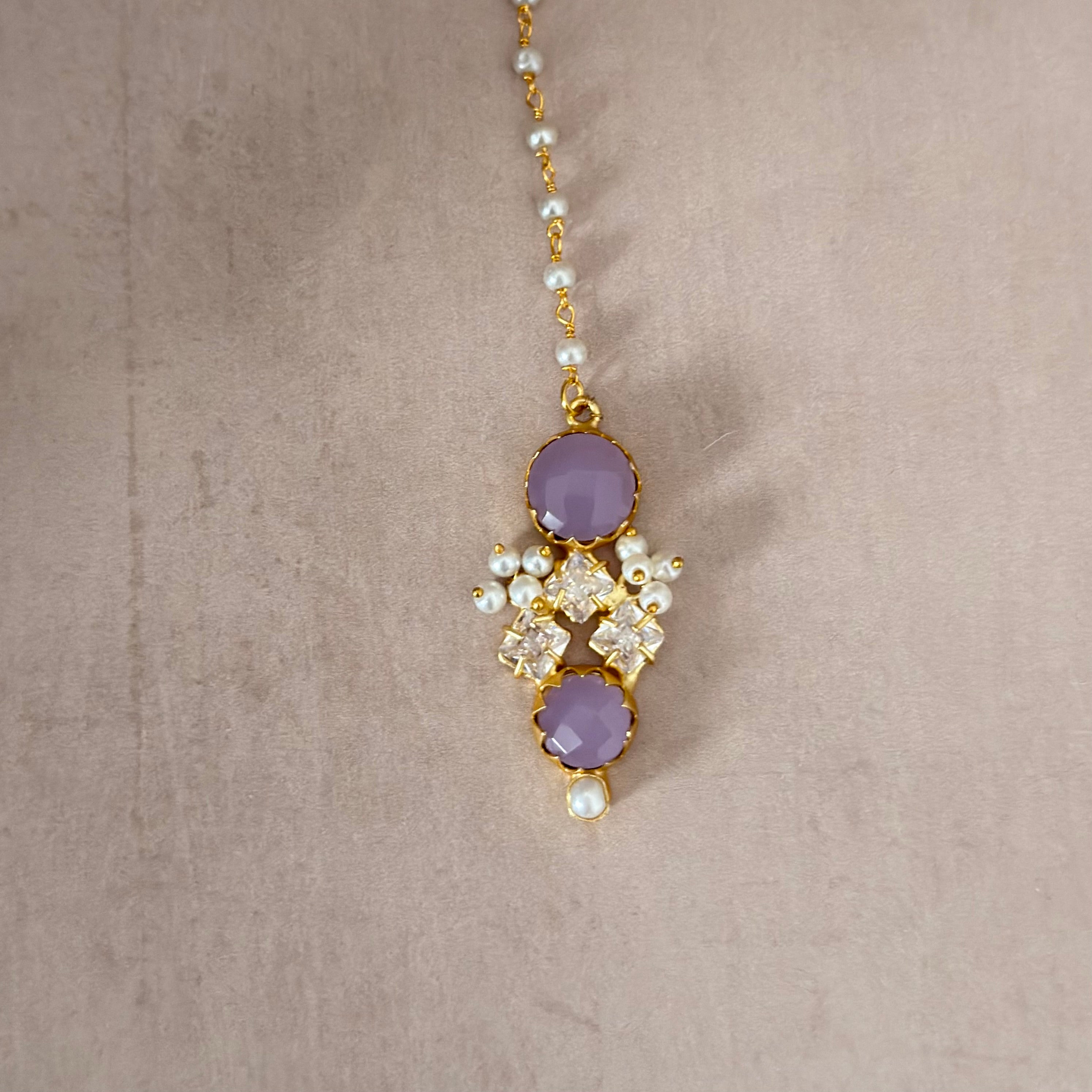 The Miah Lilac Choker Set brings together lilac stone with sparkling cubic zirconia crystals. Complete with a choker, stud earrings, and tikka, this three-piece set delivers sophisticated style for every celebration.