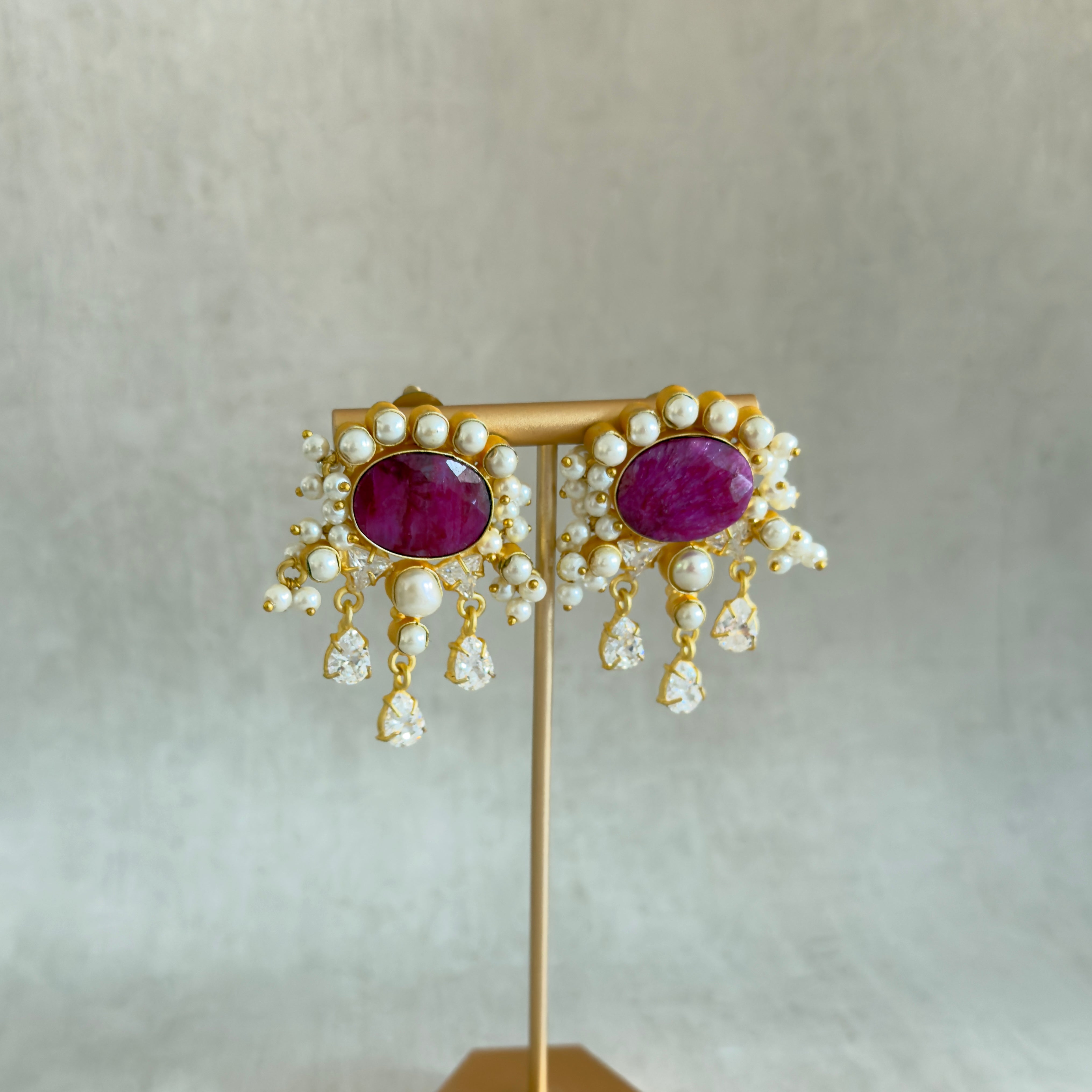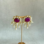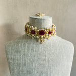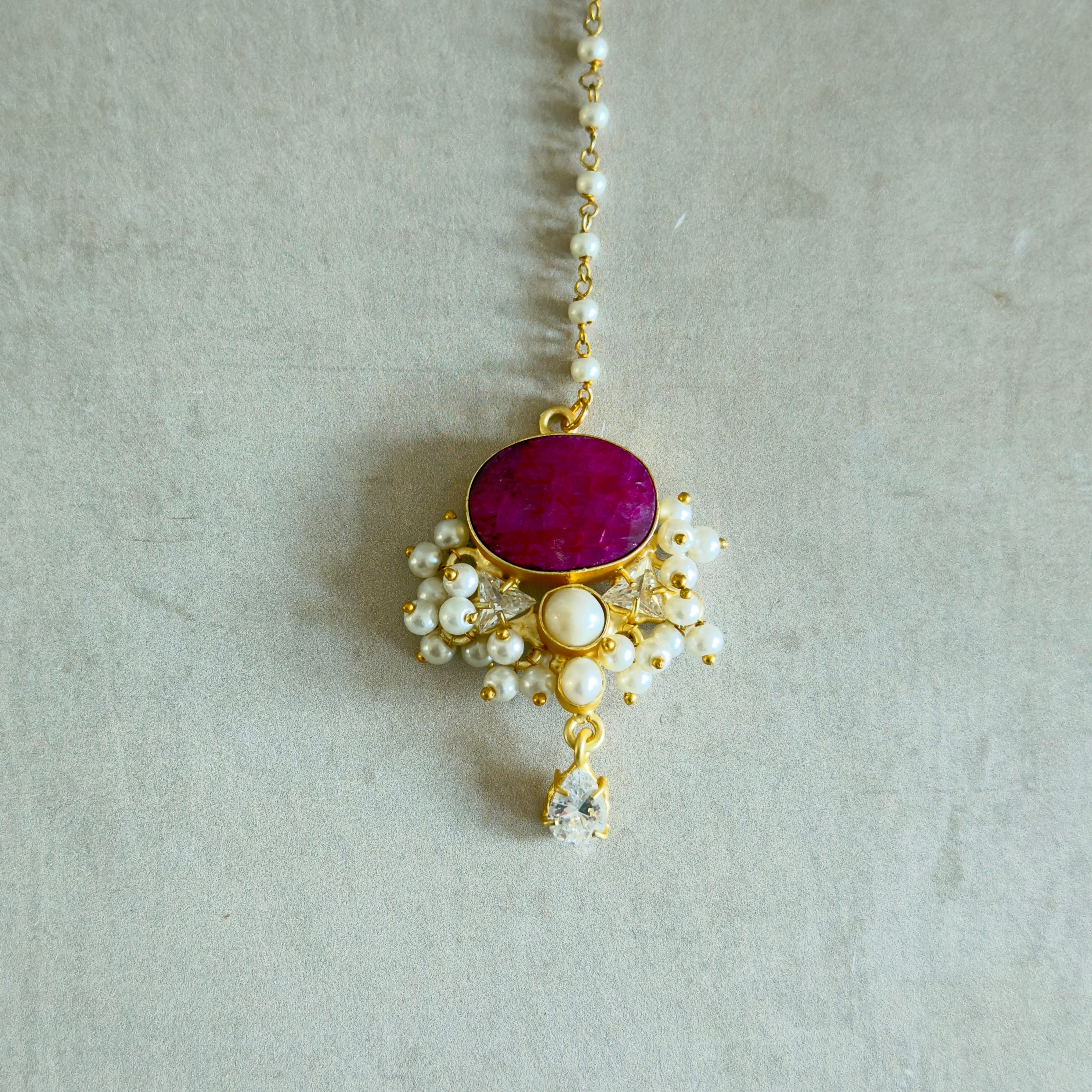 Elevate your look with the Khawla Fuchsia Pearl Choker Set, a stunning three piece jewellery set designed to turn heads. This exquisite set features a choker adorned with lustrous pearls, shimmering cubic zirconia crystals, and rich ruby corundum stones that catch the light beautifully. Paired with matching stud earrings and a tikka, this coordinated set offers effortless elegance for weddings, celebrations, or special occasions.