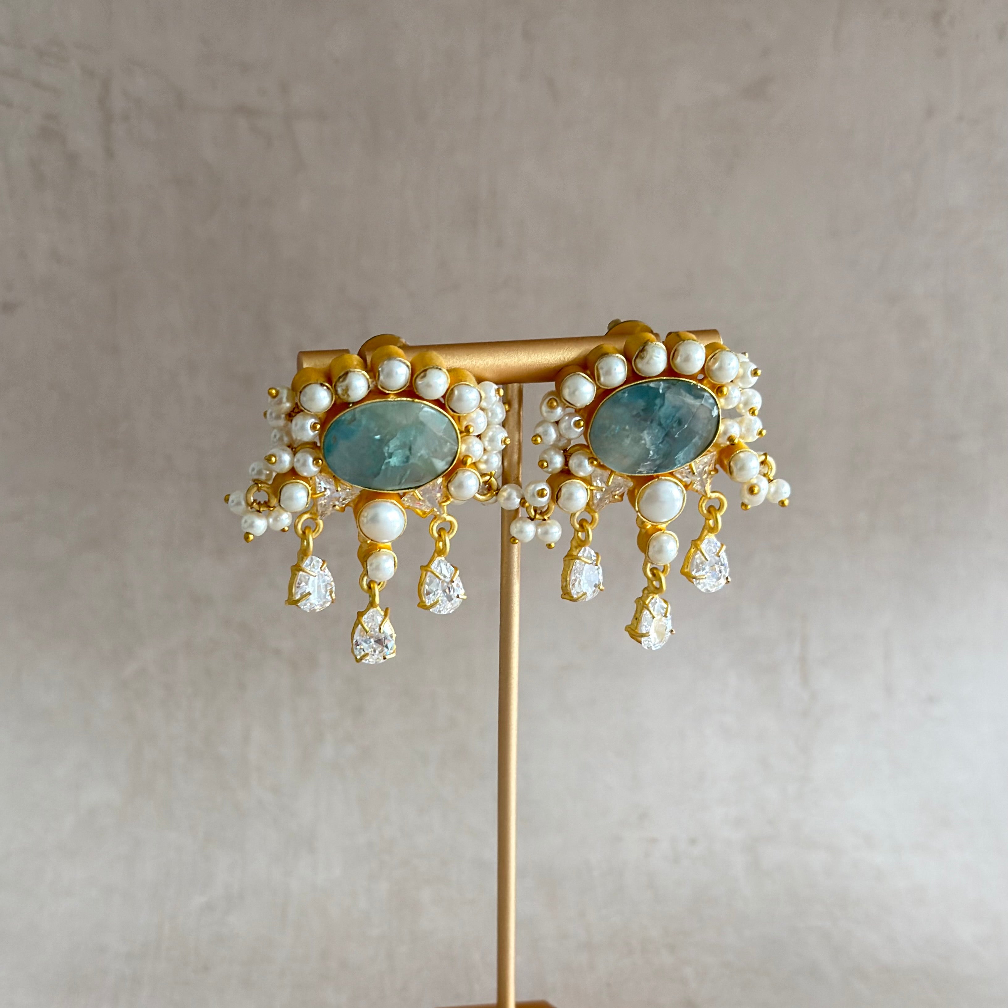 Elevate your look with the Khawla Mint Pearl Choker Set, a stunning three piece jewellery set designed to turn heads. This exquisite set features a statement choker adorned with soft aquamarine stone and shimmering cubic zirconia crystals, that catch the light beautifully. Paired with matching stud earrings and a tikka, this statement choker set offers effortless glamour, perfect for weddings, celebrations, and special occasions.