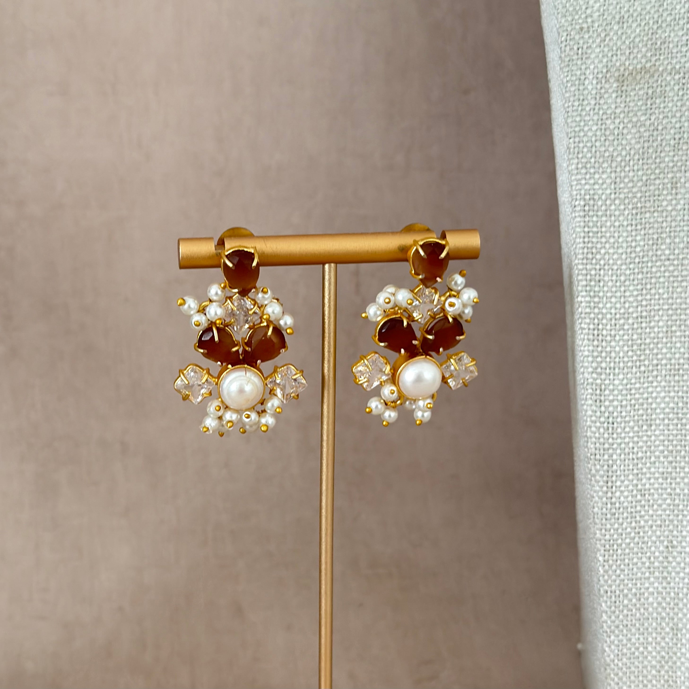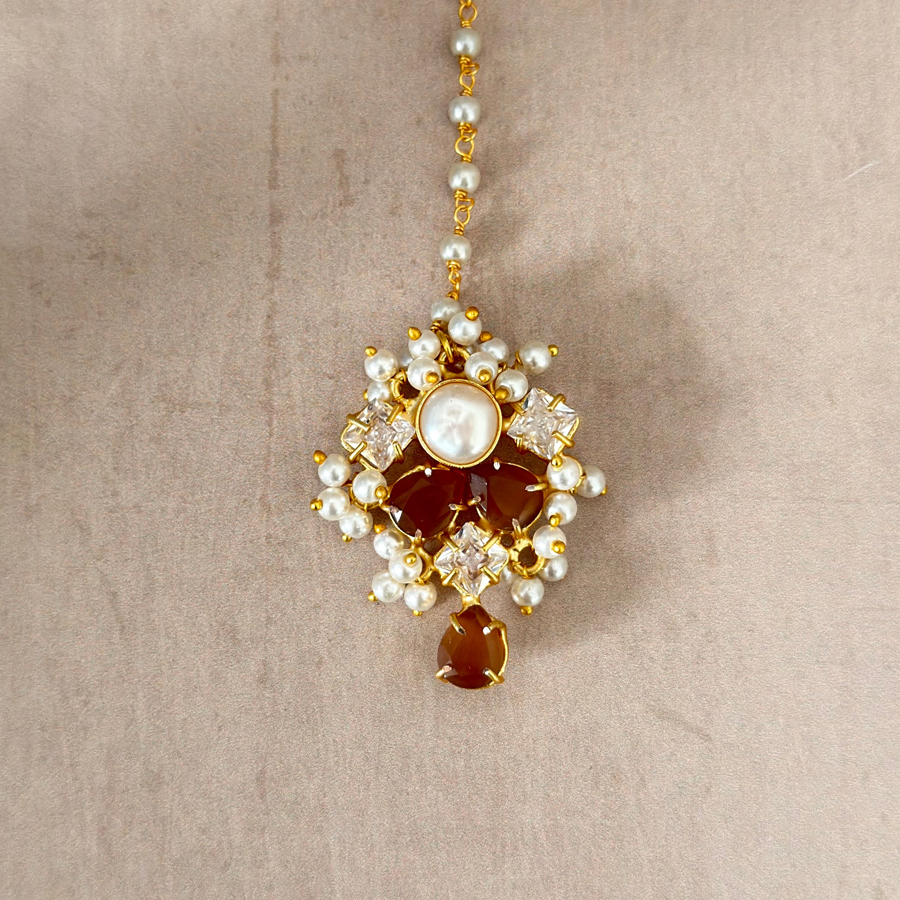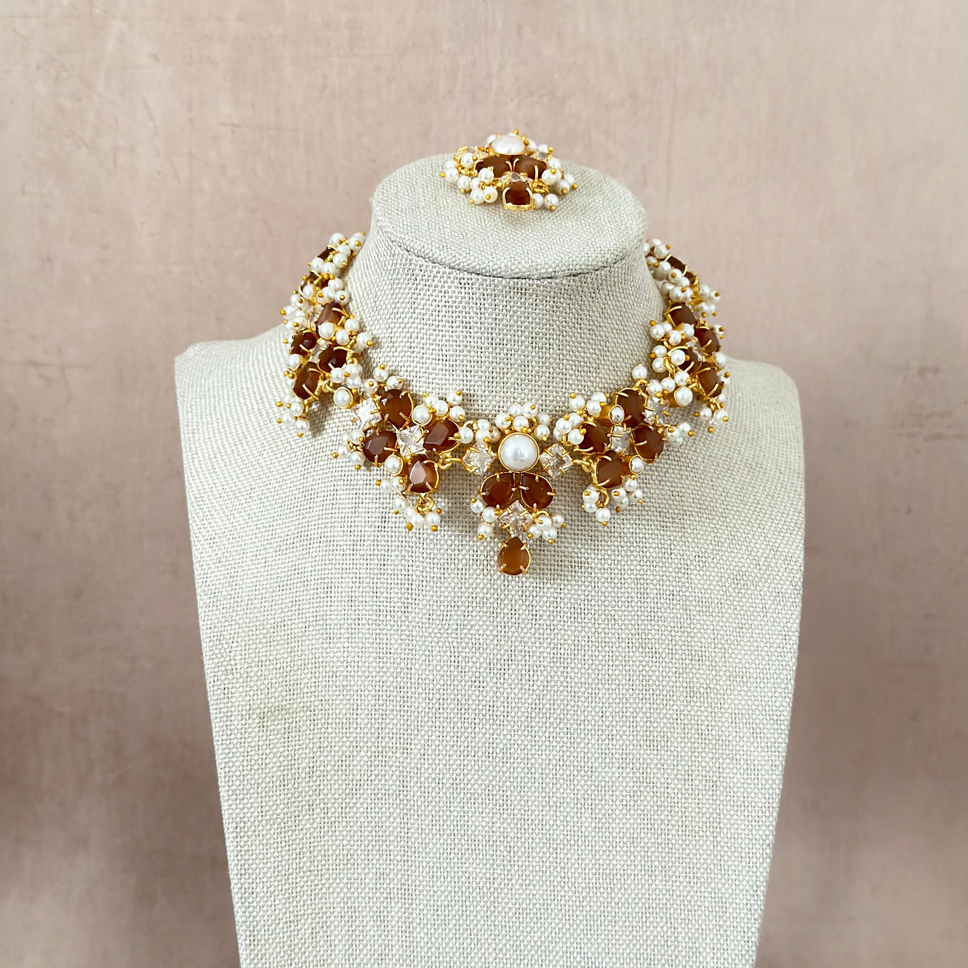 Elevate your elegance with the Shyla Espresso Choker Set, featuring enchanting hues of browns, beautifully complemented by delicate pearl accents. This captivating set includes matching stud earrings and a tikka, perfect for adding glamorous touch to your ensemble. Perfect for any occasion.