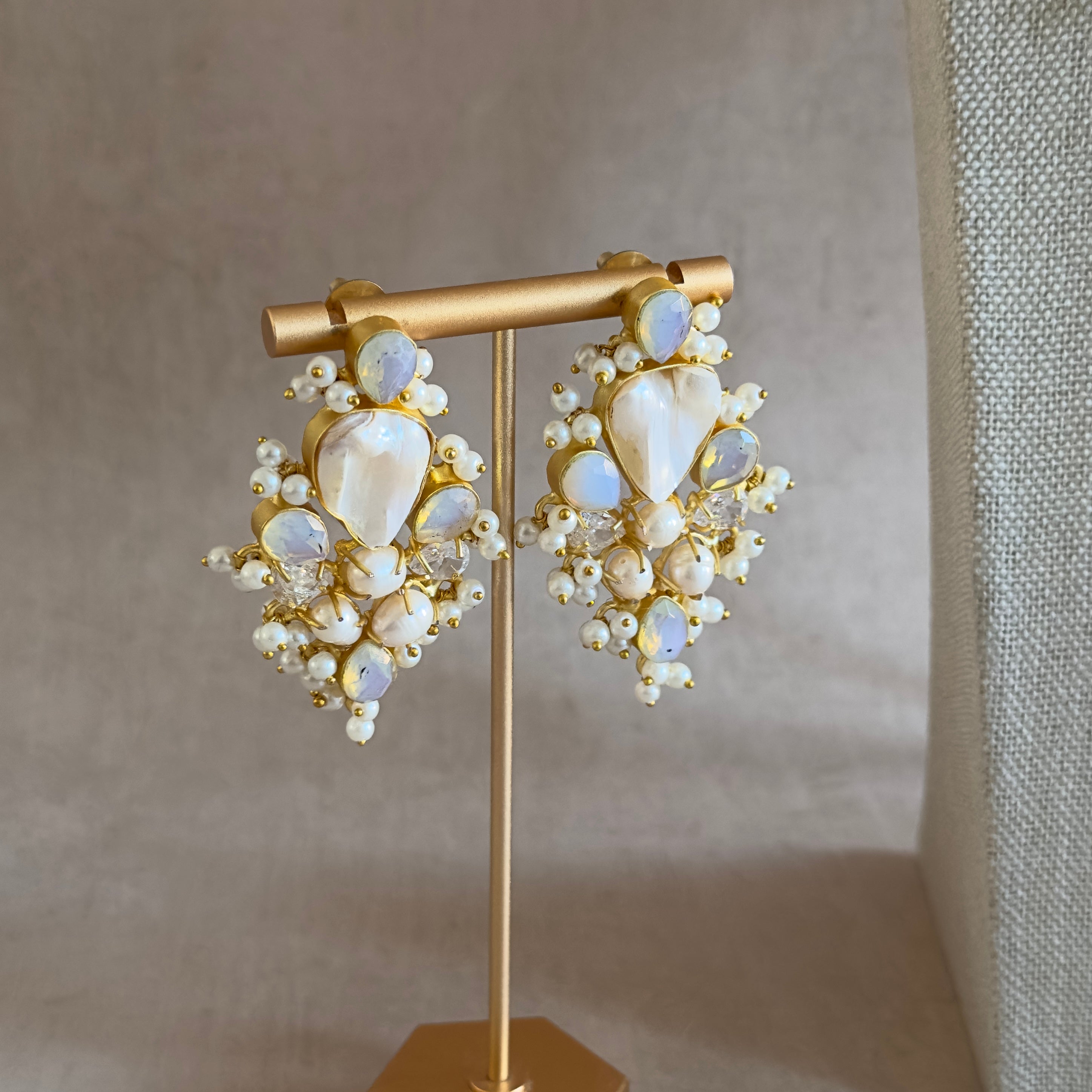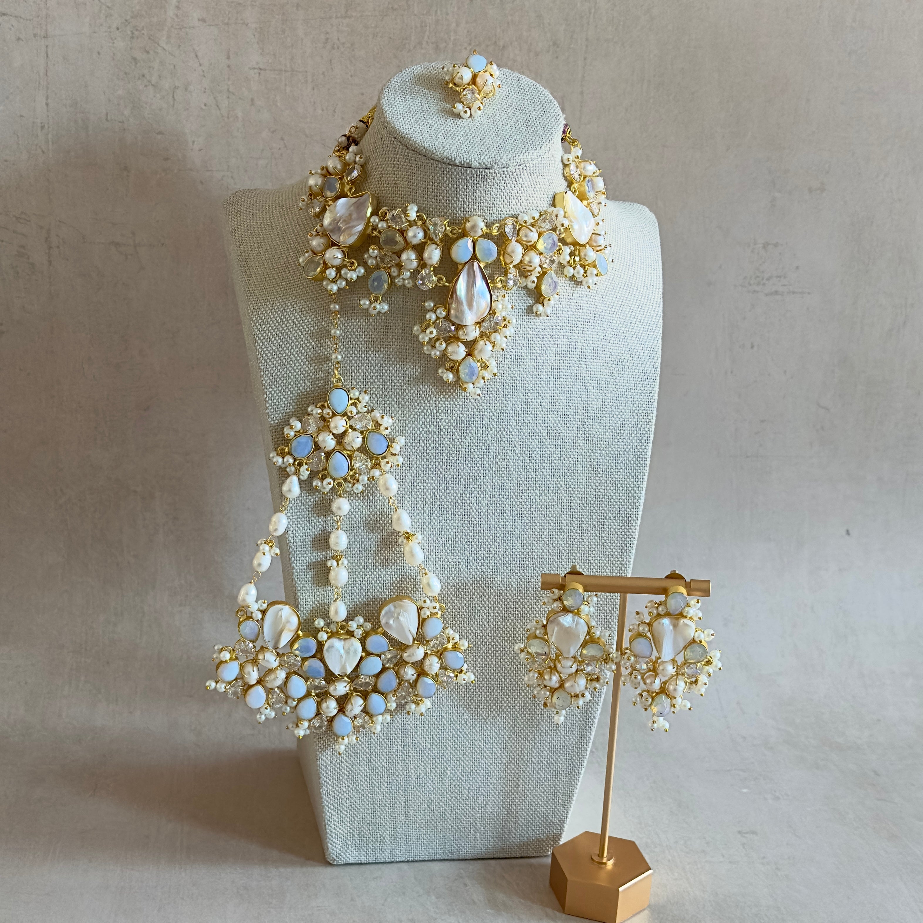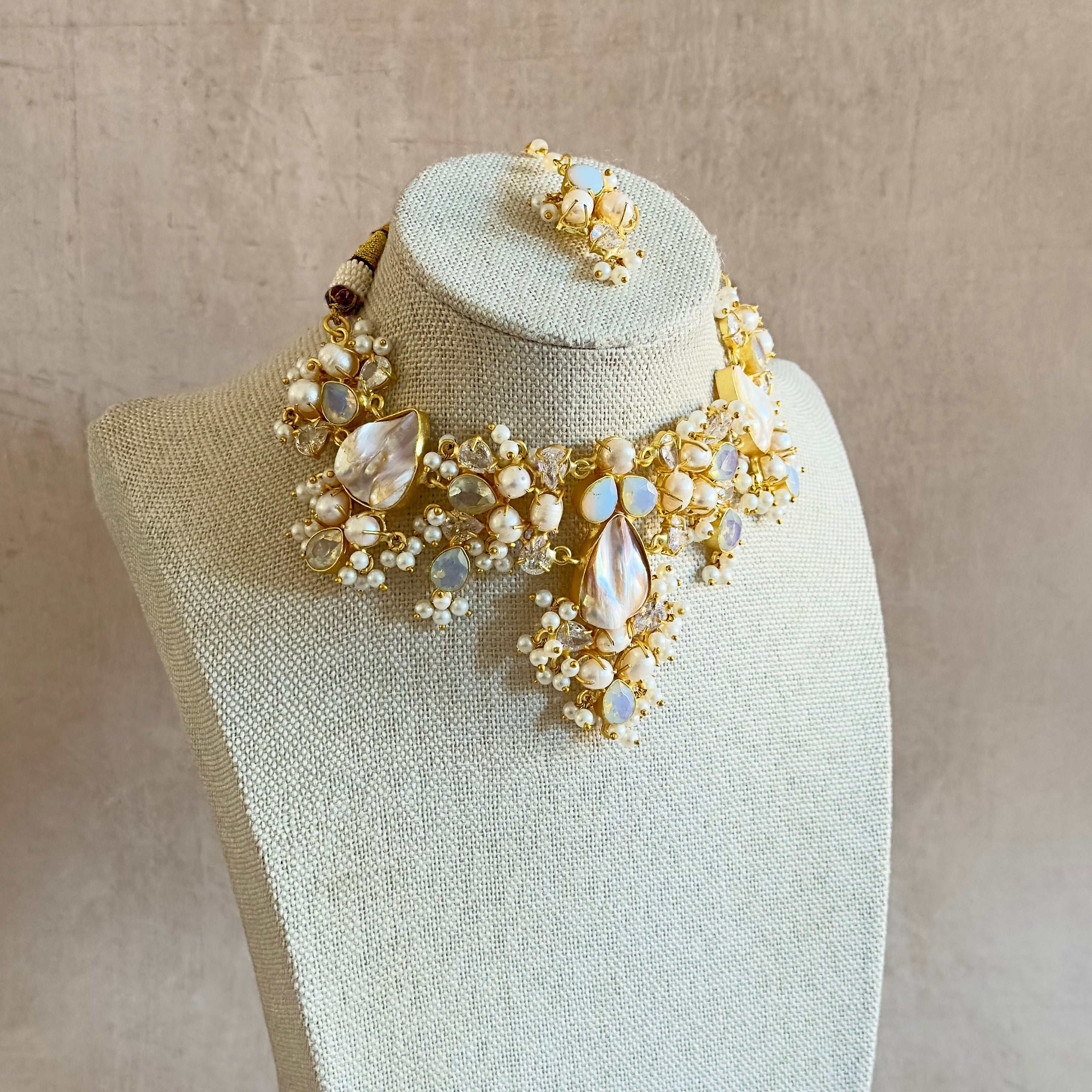 Elevate your elegance with the Antonia Pearl Choker Set, featuring luminous opalite stone and unique baroque pearls accented by sparkling cubic zirconia crystals. This sophisticated set includes matching stud earrings and a delicate tikka, perfect for adding a refined touch your ensemble.