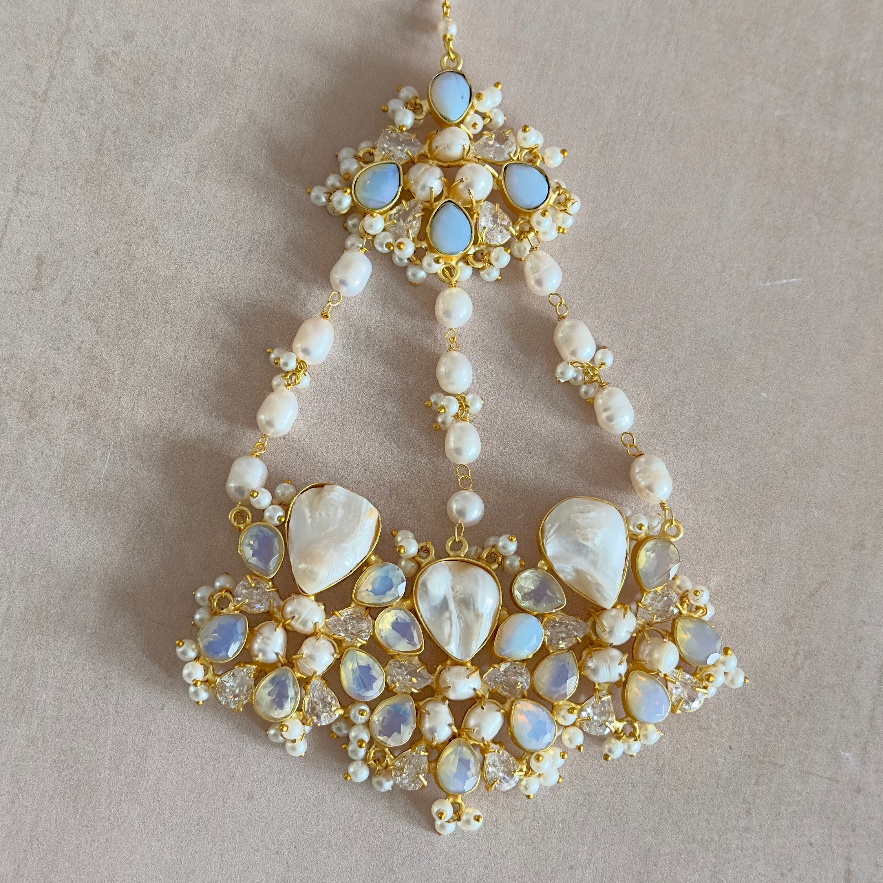 The Antonia Pearl Jhumar is a statement headpiece, crafted with opalite stone and lustrous pearls, embodying understated elegance. Pair it with our Antonia Choker Set to complete a sophisticated traditional look that exudes timeless charm.