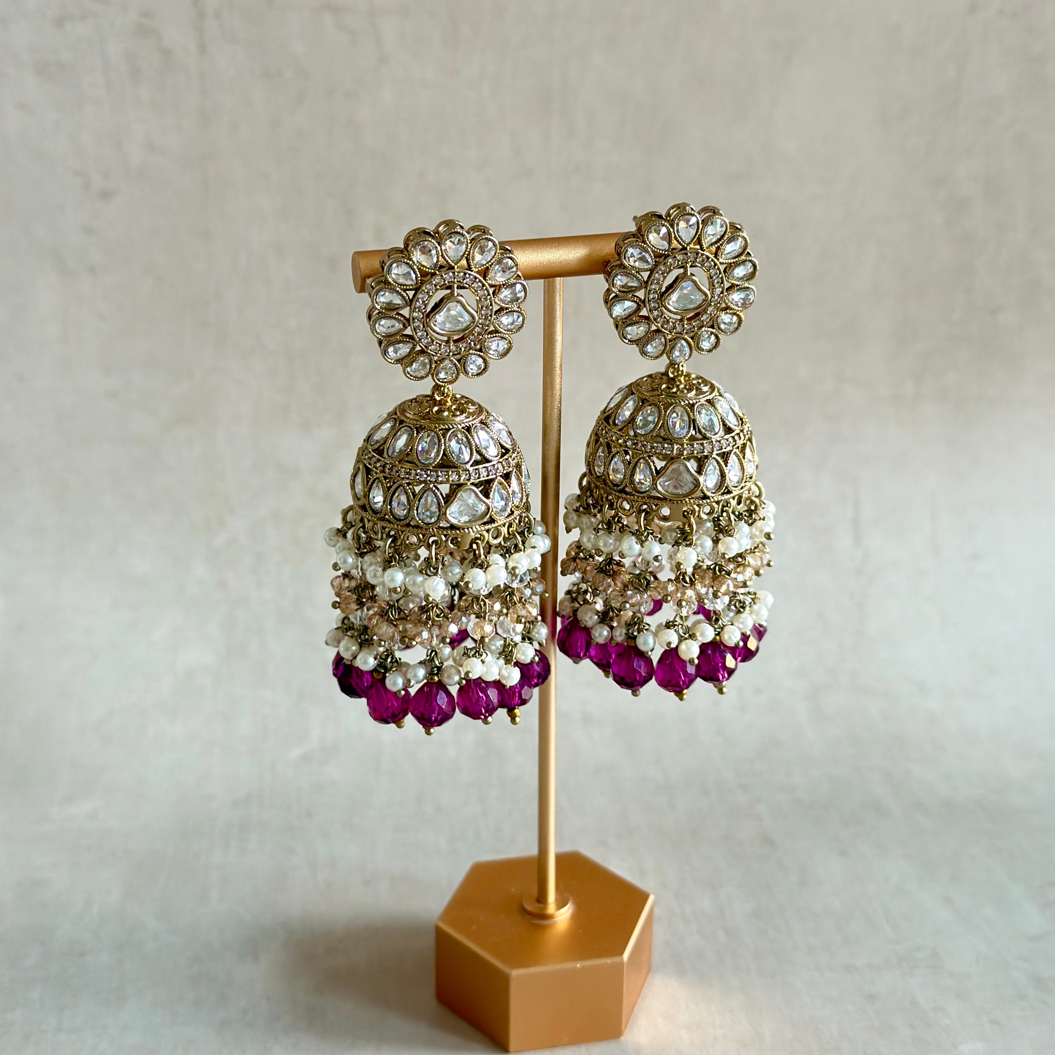 Elevate your style with our traditional Fatema Plum Crystal Jhumka Earrings! Adorned with stunning cubic zirconia crystals, these statement earrings will add a touch of elegance to any outfit.