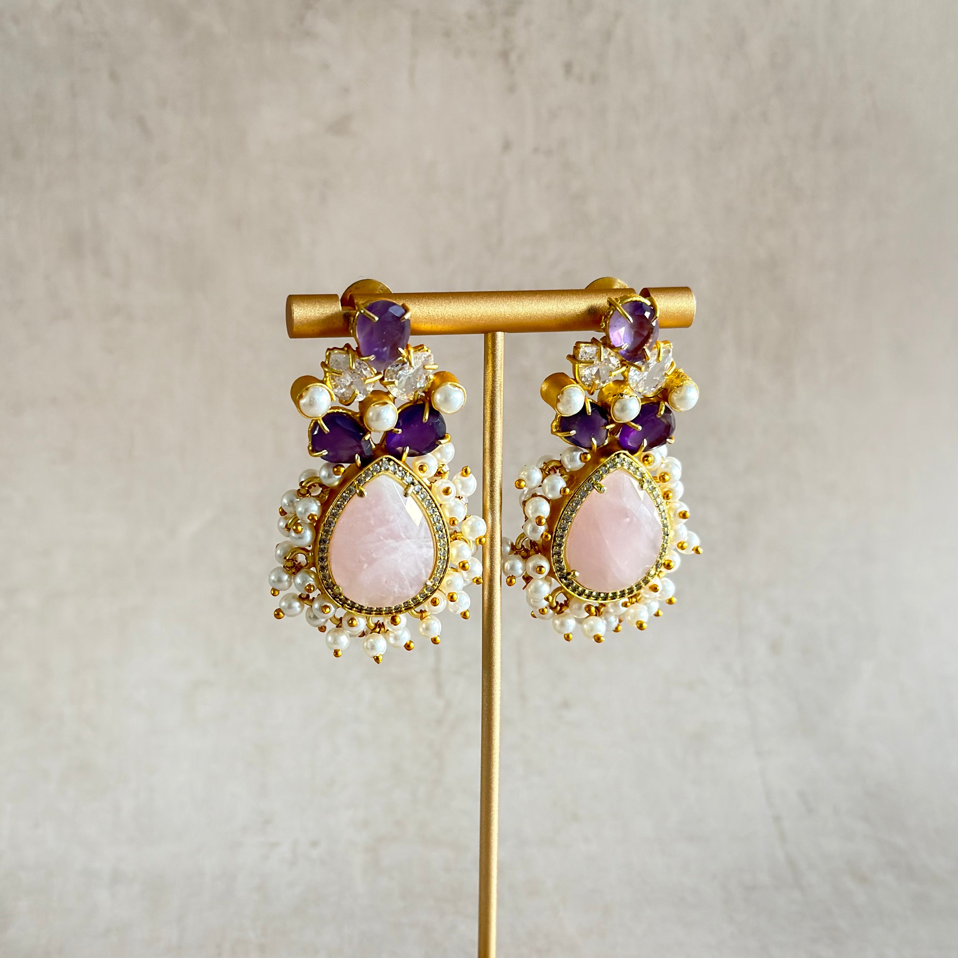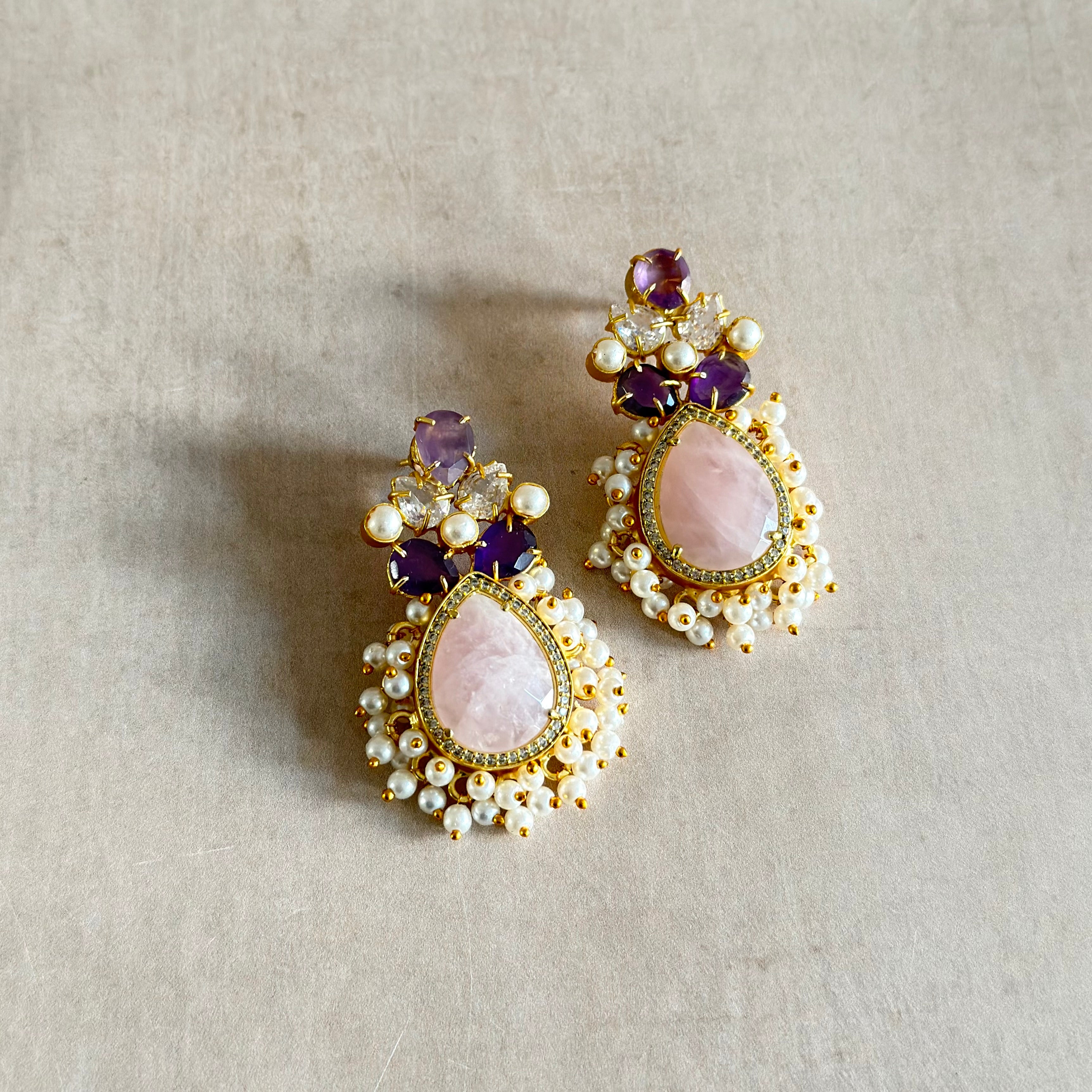 Beautiful Rose stud earrings combining amethyst and rose quartz stone with sparkling cubic zirconia. These natural gemstones create a glamorous look that works with any style. Lightweight and comfortable, they're the perfect addition to your jewellery collection.