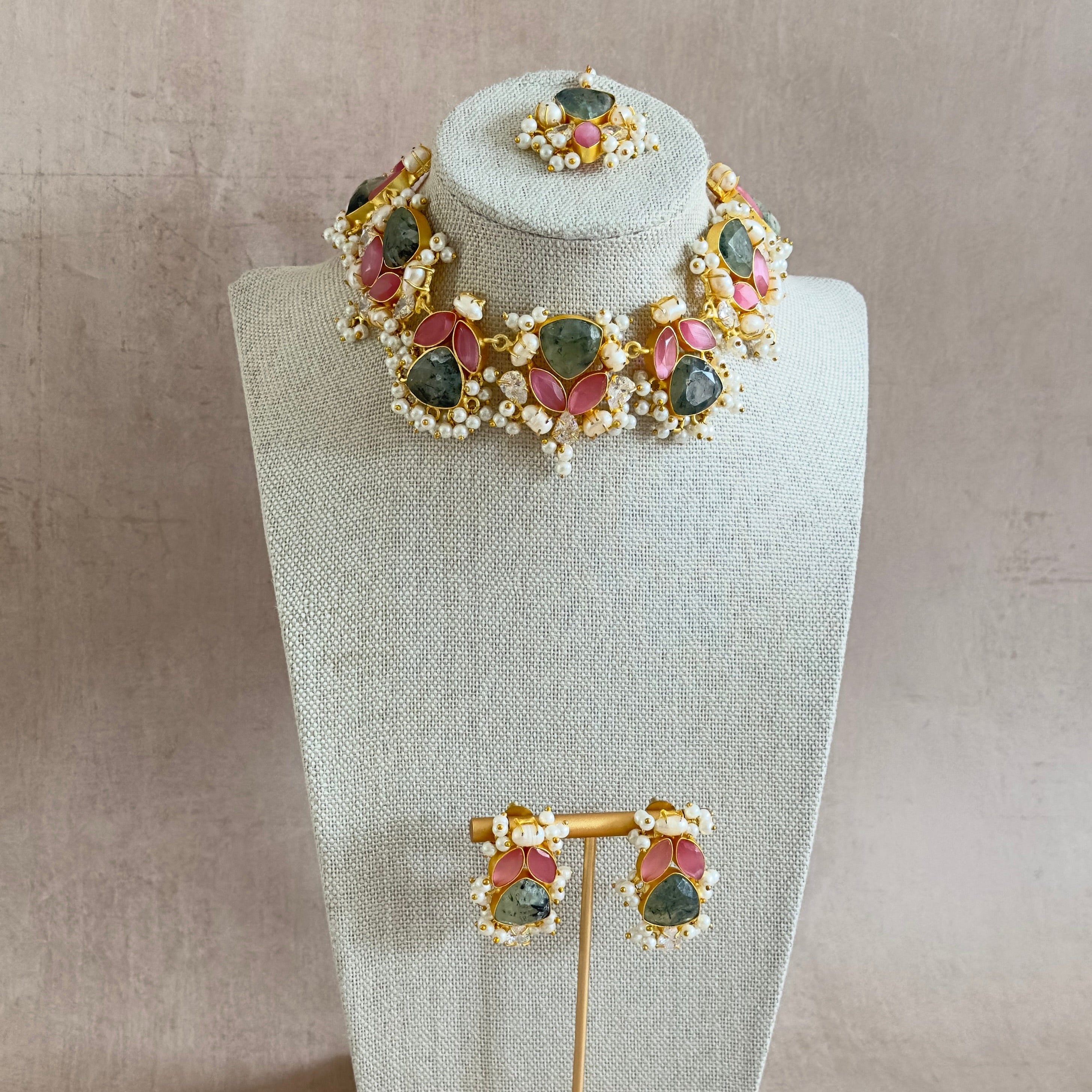 Elevate your elegance with the Giselle Olive Pink Choker Set, featuring stunning hues of green prehnite and pink monalisa stone, enhanced by sparkling cubic zirconia crystals and delicate pearl accents. This exquisite set includes matching stud earrings and a tikka, perfectly designed to add a touch of sophistication to any outfit. Ideal for special occasions.