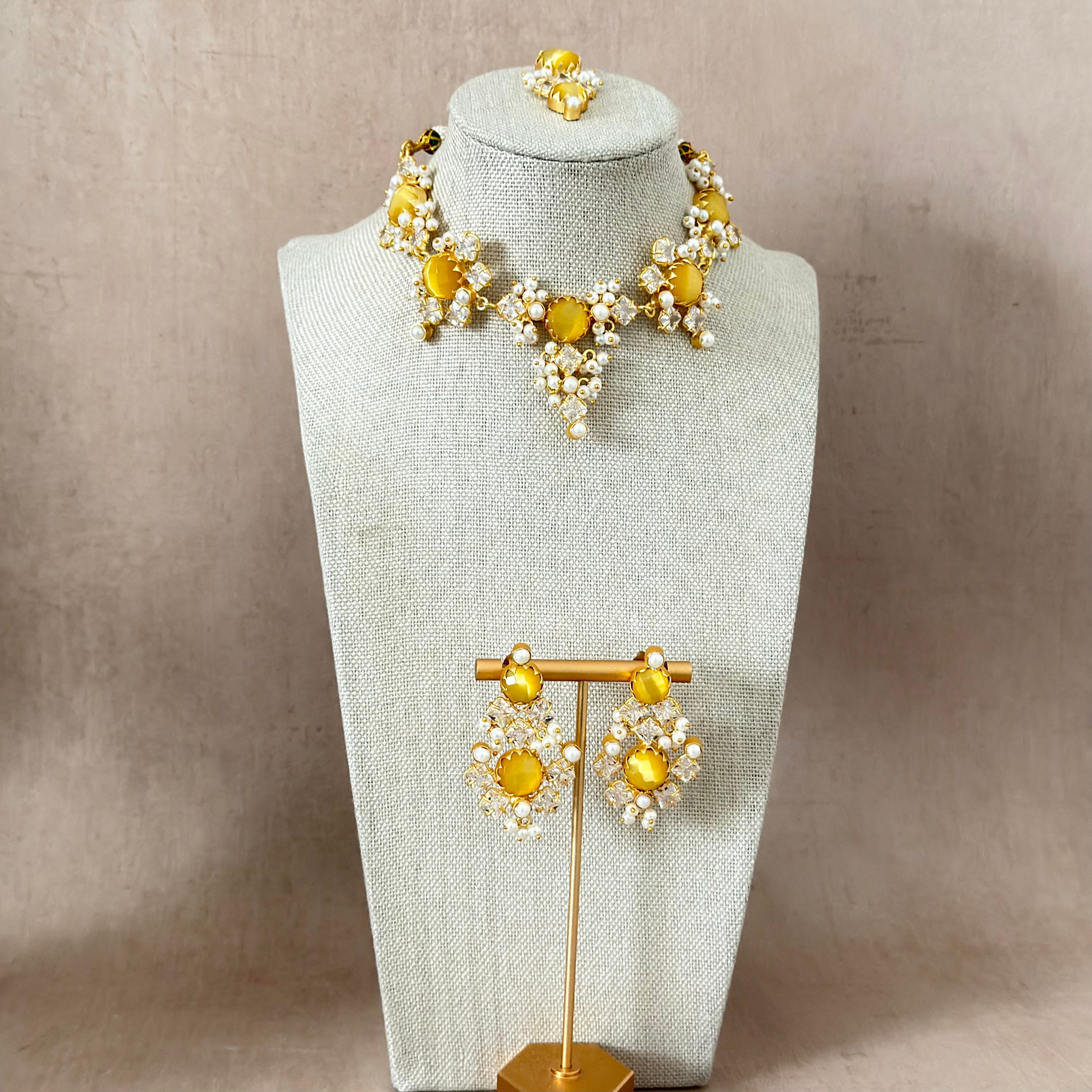 The Miah Lemon Choker Set features a beautiful yellow monalisa stones paired with sparkling cubic zirconia crystals. This elegant choker adds instant glamour to any look, with its warm golden tones and brilliant sparkle. Perfect for special occasions.
